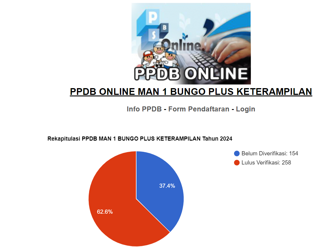 Sampai saat ini Minggu 30/06/2024 Pukul 12.10 Wib terpantau sejumlah 412 orang Siswa/ i Calon Peserta Didik Baru yang sudah mendaftar. Terhitung masih ada 1 hari lagi MAN 1 Bungo membuka Pendaftaran PPDB Tahun ini yakni dari rentang 01 April s.d 01 Juli 2024.