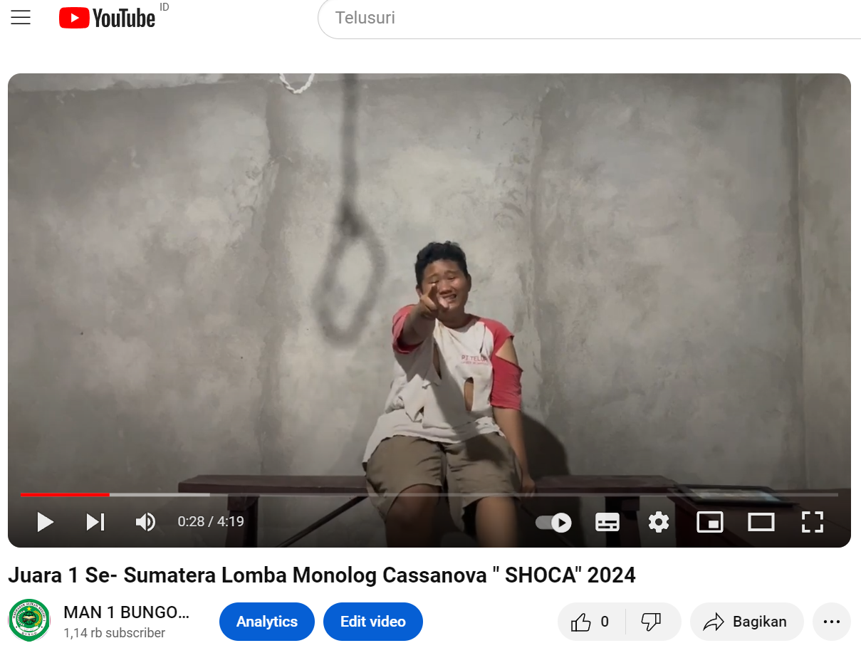 Rahmad Alihsan fikri merupakan peserta cabang Monolog yang dalam seleksi nya membacakan Puisi Karya Chairul Anwar yang berjudul “Aku Si Kosongâ€. Video Monolog dikirim kemudian diseleksi dan Alhamdulilah Fikri berhasil lolos dalam 14 besar dan berhak tampil mengikuti seleksi Monolog kedua pada Hari Jum’at, 27 September 2024 dari Pukul 13.10 WIB s.d selesai di Gedung Serbaguna MAN 1nsan Cendikia Jambi.