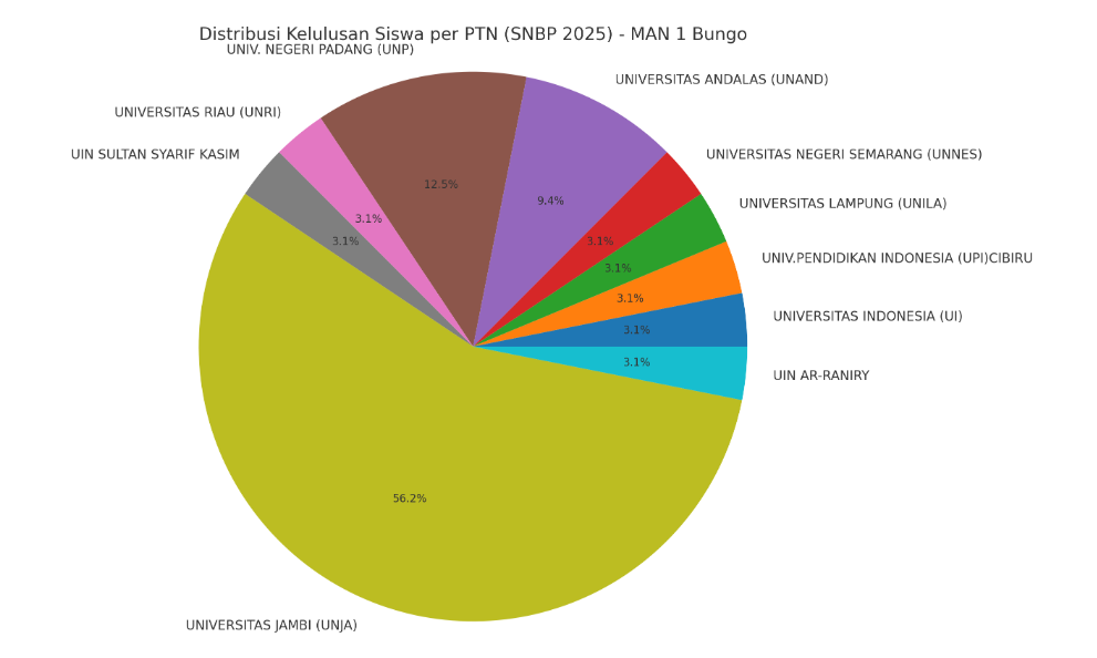 "Distribusi penerimaan siswa kami cukup merata di berbagai universitas dengan program studi yang beragam, mulai dari Ilmu Hukum, Kedokteran, Farmasi Teknik, Akuntansi, hingga Pendidikan," tambah Wakil Kepala Madrasah Bidang Kurikulum MAN 1 Bungo Ibu Karmi, M.Pd.