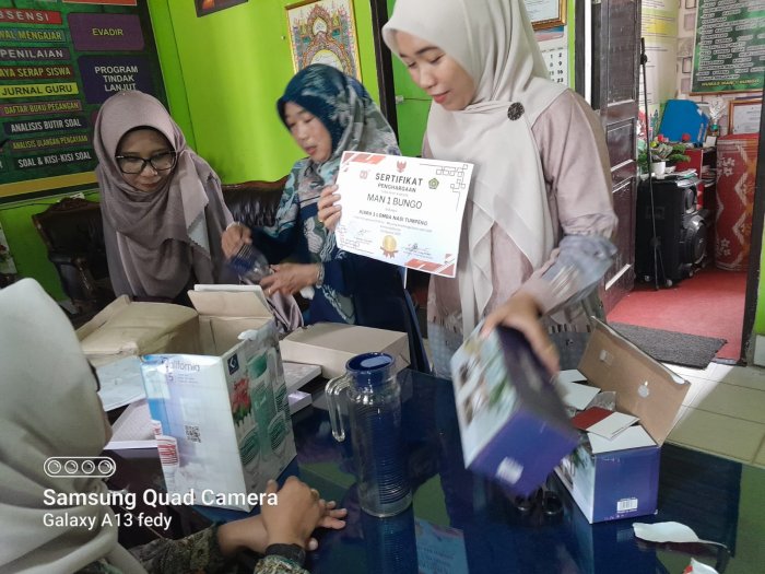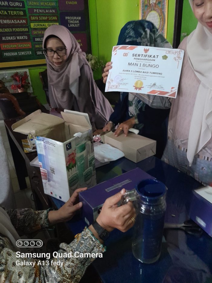 Bungo - Suasana gembira menyelimuti ruang guru MAN 1 Bungo pada hari ini Jum'at 29 Agustus 2025 saat para guru melakukan unboxing hadiah juara pertama Lomba Menghias Nasi Tumpeng Antar Satuan Kerja (Satker) Kementerian Agama Kabupaten Bungo dalam rangka peringatan HUT RI Ke-80. Momen istimewa ini turut disaksikan oleh Ibu Hipsri Yumaharnita selaku ketua Dharma Wanita Persatuan (DWP) MAN 1 Bungo.