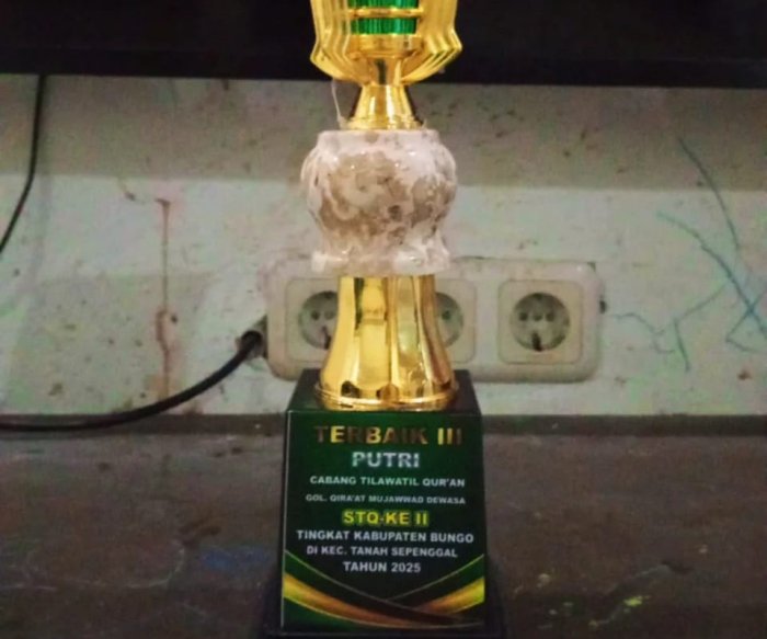 Bungo(MAN 1 Bungo) - Nora Uswathun Hasanah, M.Pd, guru di MAN 1 Bungo, berhasil meraih Juara III kategori Putri Cabang Tilawatil Qur'an Golongan Qiraat Mujawwad Dewasa pada ajang Seleksi Tilawatil Qur'an (STQ) Ke-II Tingkat Kabupaten Bungo Tahun 2025. Ia mewakili Kecamatan Tanah Sepenggal Lintas dalam kompetisi yang berlangsung di tingkat kabupaten tersebut.