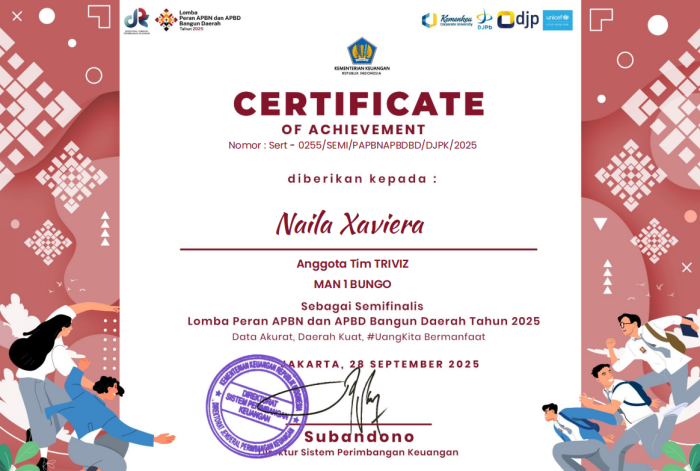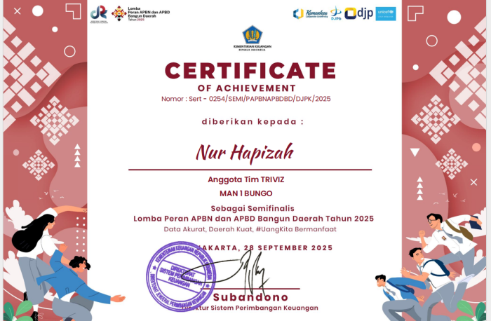BUNGO – MAN 1 Bungo kembali menorehkan prestasi membanggakan melalui Tim Trivis yang berhasil meraih penghargaan sebagai semifinalis dalam Lomba Peran APBN dan APBD Bangun Daerah Tahun 2025. Kompetisi ini diselenggarakan oleh Kementerian Keuangan Republik Indonesia dan diikuti oleh peserta dari seluruh Indonesia.