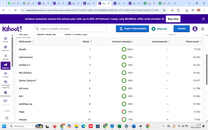 Selama ulangan berlangsung, siswa tampak antusias menjawab setiap pertanyaan. Suara tanda waktu habis dan notifikasi peringkat yang muncul di layar menambah semangat kompetisi yang sehat di antara mereka. Sistem penilaian Kahoot yang menggabungkan kecepatan dan ketepatan menjawab menuntut siswa memahami materi dengan baik serta mengambil keputusan secara cepat.