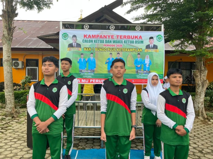 Bungo (MAN 1 Bungo)- Pemilihan Ketua dan Wakil Ketua Organisasi Siswa Intra Madrasah (OSIM) MAN 1 Bungo periode 2026-2027 telah memasuki tahap kampanye. Pada Sabtu, 10 Januari 2026, tiga pasangan kandidat menyampaikan visi dan misi mereka secara langsung di hadapan seluruh siswa di lapangan upacara, setelah pelaksanaan senam perdana semester dua.