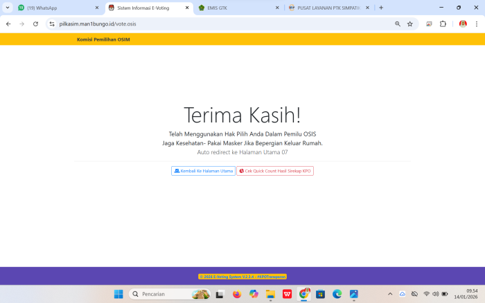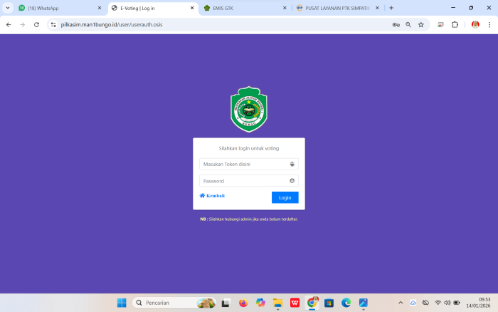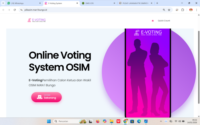 Bungo – Madrasah Aliyah Negeri (MAN) 1 Bungo menyelenggarakan pemilihan Ketua dan Wakil Ketua Organisasi Siswa Intra Madrasah (OSIM) periode 2026 secara online pada Rabu, 14 Januari 2026, pukul 09.45 WIB hingga selesai.