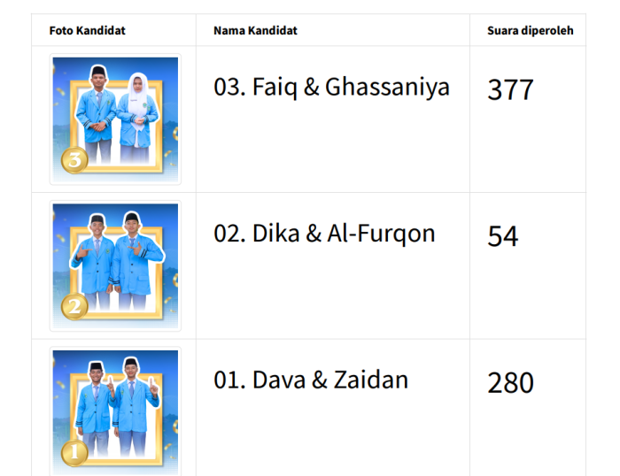 Berdasarkan hasil rekapitulasi pemilihan yang diselenggarakan secara elektronik melalui sistem E-Voting pada Rabu, 14 Januari 2026, pasangan Faiq & Ghassaniya meraih kemenangan mutlak dengan perolehan suara sebagai berikut: Faiq & Ghassaniya (Nomor Urut 3): 53% suara; Dava & Zaidan (Nomor Urut 1): 39% suara; dan Dika & Al-Furqon (Nomor Urut 2): 7% suara
