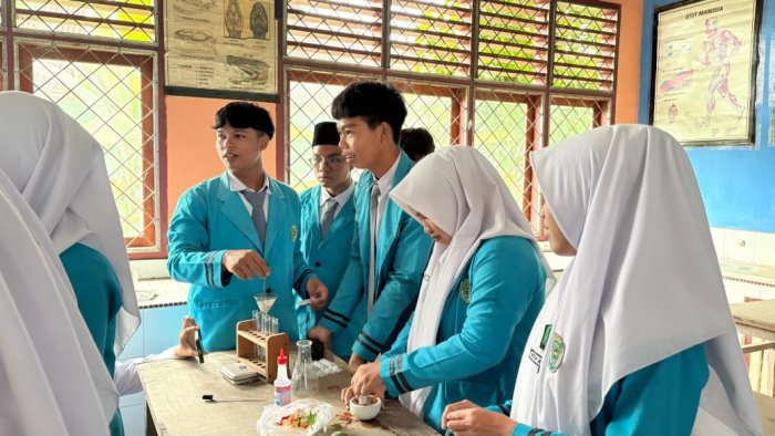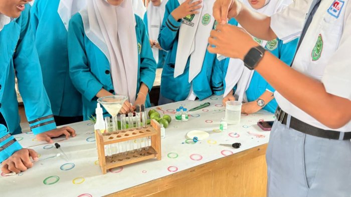 Para siswa terlihat antusias mengikuti setiap tahapan praktikum. Mereka bekerja dalam kelompok kecil, membagi tugas mulai dari menyiapkan alat dan bahan, melakukan ekstraksi, hingga menguji indikator yang telah dibuat pada berbagai larutan seperti air sabun, cuka, air jeruk, dan larutan garam.