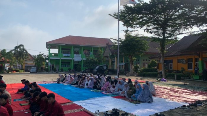 Sejak pagi, para siswa sudah berkumpul dengan tertib di lapangan. Mereka mengenakan seragam sekolah dan mengikuti sholat dhuha secara berjamaah dengan penuh kekhusyukan. Suasana khidmat tampak jelas ketika ratusan siswa bersama-sama menunaikan ibadah sunnah tersebut di bawah bimbingan guru dan staf madrasah.