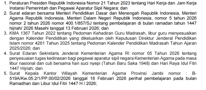 Penerapan sistem WFA dan WFO ini didasarkan pada sejumlah regulasi, seperti Peraturan Presiden Republik Indonesia Nomor 21 Tahun 2023 tentang Hari Kerja dan Jam Kerja Instansi Pemerintah dan Pegawai Aparatur Sipil Negara. Selain itu, kebijakan ini juga merujuk pada Surat Edaran Bersama Menteri Pendidikan Dasar dan Menengah, Menteri Agama, dan Menteri Dalam Negeri Nomor 5 Tahun 2026 tentang Pembelajaran di Bulan Ramadhan Tahun 1447 H/2026 M.