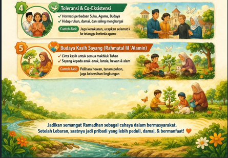 "Lebaran usai, tapi semangat Ramadhan jangan sampai ikut selesai. Mari kita jadikan semangat Ramadhan sebagai cahaya yang terus menerangi kehidupan bermasyarakat kita. Setelah Lebaran, saatnya kita buktikan diri sebagai pribadi yang lebih peduli, lebih damai, dan lebih bermanfaat bagi sesama. Kelima nilai sosial Ramadhan ini bukan hanya milik bulan Ramadhan, tetapi harus menjadi karakter dan gaya hidup kita sepanjang tahun sebagai muslim yang sejati dan warga madrasah yang berakhlak mulia," ujar Dony Afrian.