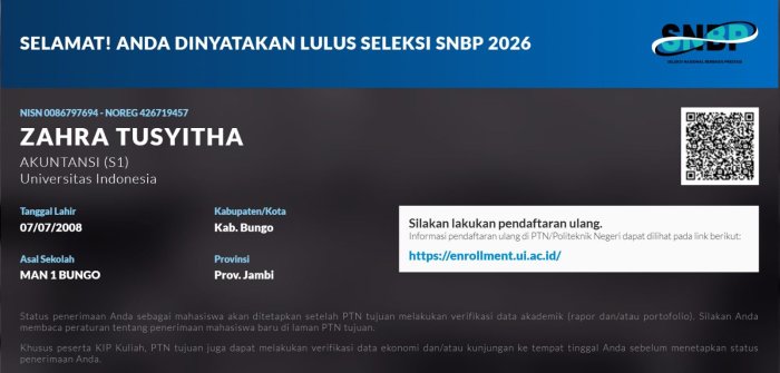 Ketiga siswa yang berhasil lolos adalah Tio Noer Ashari, Zahra Tusyitha dan Vania Muthi'ah Zahra. Tio Noer Ashari di Program Studi Pendidikan Dokter (S1), Zahra Tusyitha diterima di Program Studi Akuntansi (S1) dan Vania Muthi'ah Zahra di Program Studi Farmasi (S1). Mereka merupakan lulusan MAN 1 Bungo dan berasal dari Kabupaten Bungo, Jambi. Pengumuman resmi kelulusan dapat diakses melalui laman pengumuman-snbp.snpmb.id, dan para siswa telah diarahkan untuk melakukan pendaftaran ulang di enrollment.ui.ac.id.