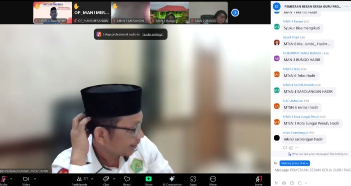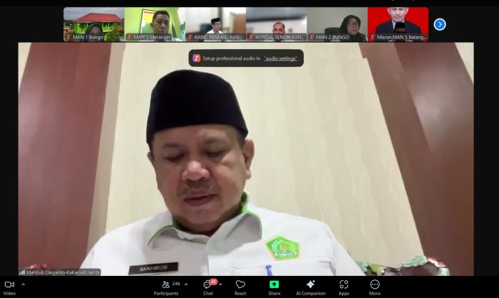 Bungo- Wakil Kepala Madrasah Bidang Kurikulum MAN 1 Bungo, Karmi, M.Pd., mengikuti rapat koordinasi bidang pendidikan madrasah yang diadakan secara daring oleh Kantor Wilayah Kementerian Agama Provinsi Jambi. Kegiatan ini berlangsung pada Selasa, 7 April 2026, mulai pukul 08.00 WIB hingga selesai, melalui platform Zoom.